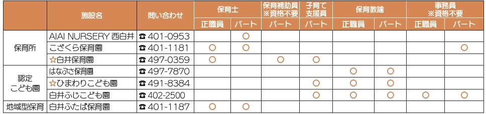 詳細は直接各施設にお問合せください。☆マークのある施設は、働きながら保育士資格の取得を応援している施設です。