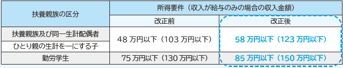 年齢19歳以上23歳未満の親族の内、合計所得が58万円超123万円以下(給与収入のみの場合:収入123万円超188万円以下)の場合、扶養控除を適用できない人も段階的に控除を受けられるようになります。