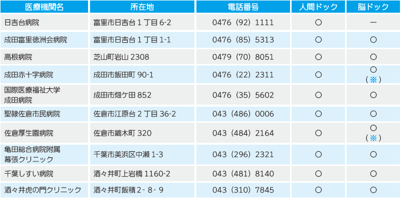 ※成田赤十字病院と佐倉厚生園病院では、脳ドックだけの受検はできません。