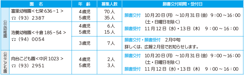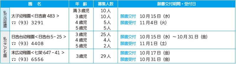 ・私立幼稚園・私立こども園については、各園へ直接問い合わせてください。