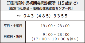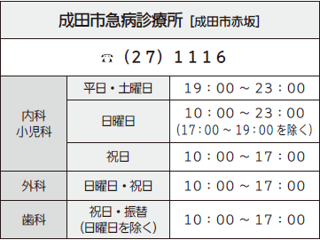 成田市急病診療所・印旛市郡小児初期急病診療所の受付は、診療時間終了15分前までです。