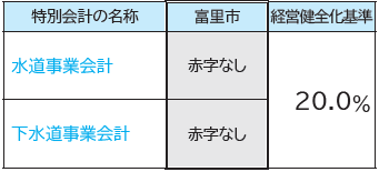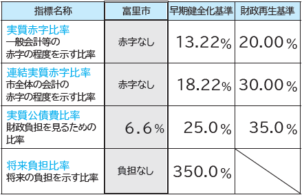 富里市は、2つの表のとおり、全ての指標が早期健全化基準を下回り、前年度に続き財政の健全性(健全段階)を示しています。