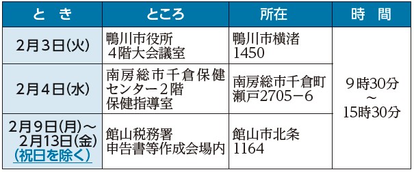 千葉県税理士会館山支部が、小規模納税者の所得税および復興特別所得税、消費税および地方消費税、年金受給者並びに給与所得者の所得税および復興特別所得税の申告(土地、建物および株式などの譲渡所得並びに山林所得がある場合を除く。)を対象に無料で相談に応じます。申告書を作成してそのまま提出できますので、前年の申告書などの控え、源泉徴収票など確定申告に必要な書類、筆記具、計算器具、印鑑およびマイナンバーに係る本人確認書類((1)マイナンバーカードまたは(2)番号確認書類および身元確認書類(3)利用者識別番号などをお持ちの方はわかる書類の写しなど)を持参してください。申告書などの提出のみの場合は、郵送または税務署窓口にてご提出ください。