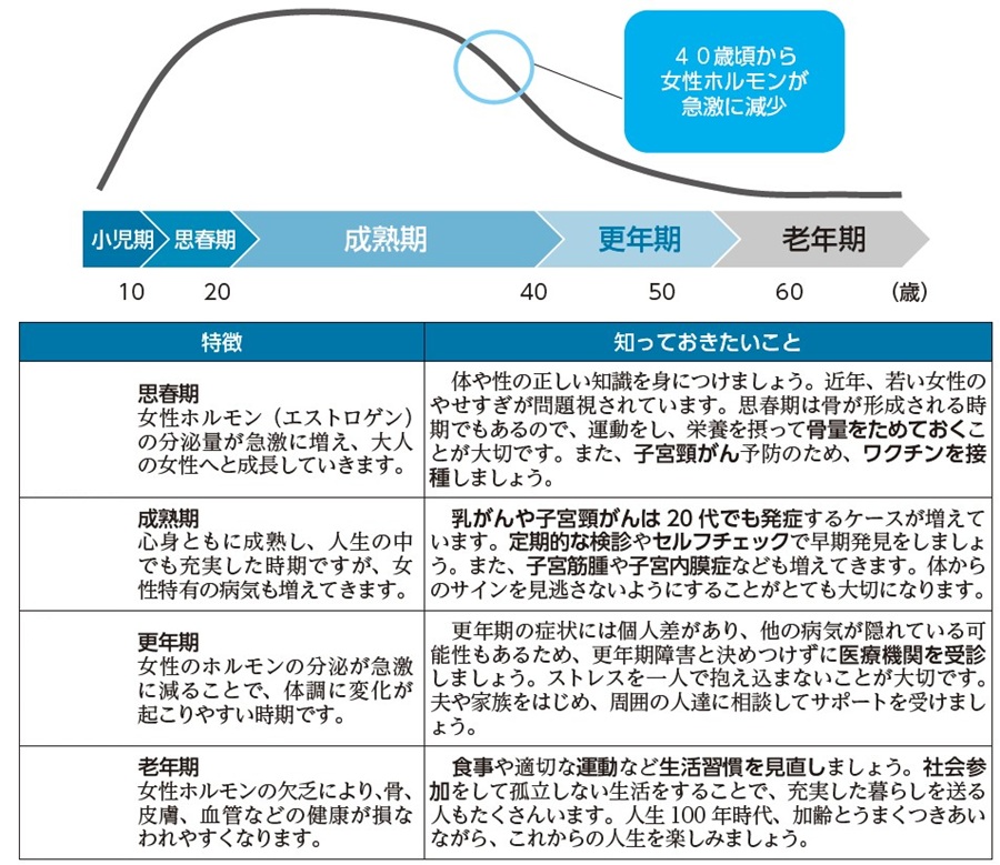 女性が生涯を通じて健康で明るく、充実した日々を過ごすための総合的な支援を目的に、厚生労働省では「女性の健康週間」を定めています。女性ホルモンの影響により、女性の心と体には様々な変化が起こります。長い人生を健康で快適に過ごせるよう、各時期の心と体の特徴を知り、日々のセルフケアをしていきましょう。