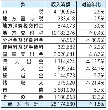 市税は、41億9,065万4千円で、前年度と比べ、市民税が減となったものの固定資産税の増などにより、1億1,805万5千円(2.9%)の増となりました。また、令和5年度に実施したし尿処理施設建設事業や外房漁村再生事業などに係る分担金及び負担金や国県支出金が減となりました。