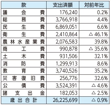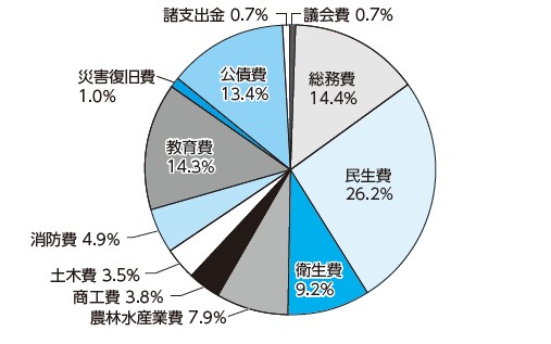 経常的経費のうち、義務的経費(人件費、扶助費、公債費)については、人件費1億3,331万8千円(3.2%)の増、扶助費2億4,570万4千円(7.8%)の増、公債費が1億7,066万5千円(4.6%)の減となり、前年度と比べ、2億835万7千円(1.9%)の増となりました。投資的経費のうち、普通建設事業費は、し尿処理施設建設事業などの完了により、前年度比5億9,437万9千円(11.0%)の減となりました。