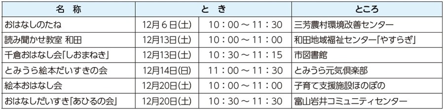 子育て おはなし会のよてい 24/37 前の記事 次の記事 発行日 : 2025年11月13日 自治体名 : 千葉県南房総市 広報紙名 : 広報みなみぼうそう 2025年11月号 絵本の読み聞かせに行ってみよう!楽しいよ! Tweet シェアする 11月12日~25日は「女性に対する暴力をなくす運動」週間 乳児相談・幼児健診・教室