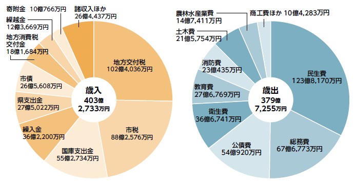令和6年度一般会計決算額は、歳入総額で403億2,733万円、歳出総額で379億7,255万円となり、歳入歳出差引額は23億5,478万円となりました。