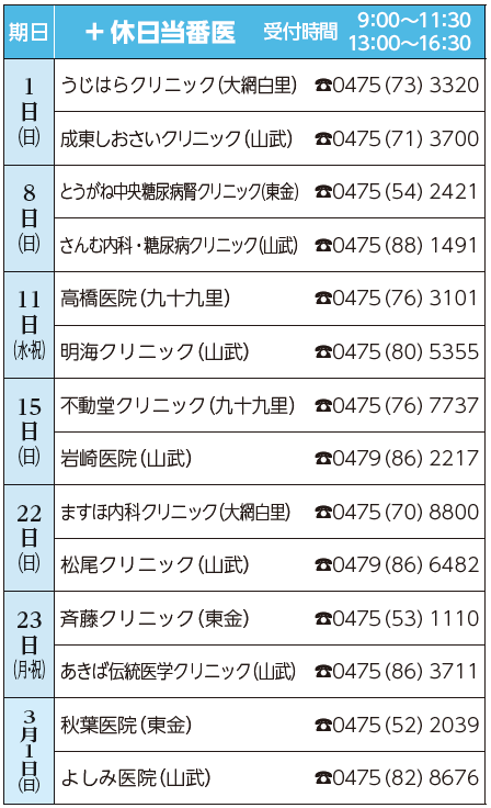 ・山武郡市急病診療所(年中無休、受付時間20:00~21:45)