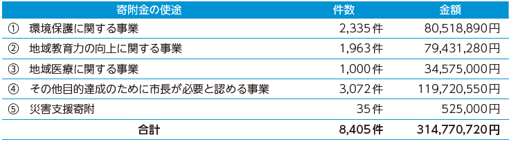 令和6年度は8,405件314,770,720円の寄附をいただきました。いただいた寄附金は環境保護に関する事業などに充当したほか「ふるさとさんむ応援基金」に積み立てました。