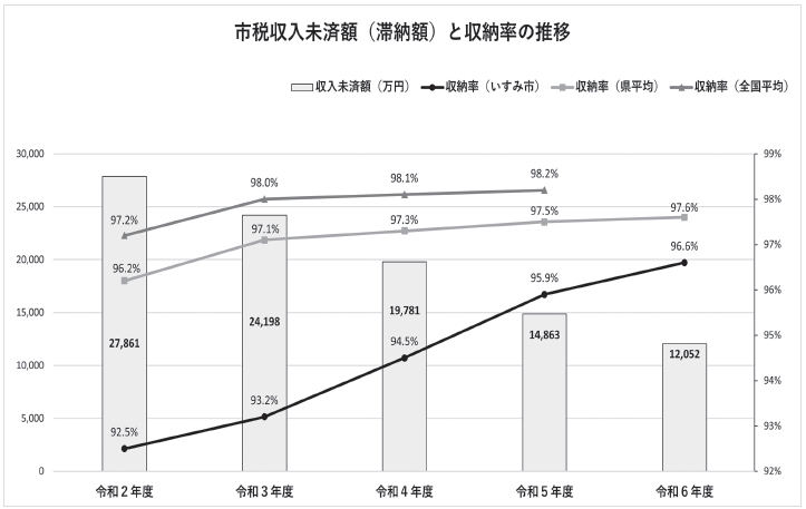 令和6年度市税の収納率は96.6%となり、前年度と比較して0.7ポイント上昇し、過去最高となりました。依然として全国・県内平均を下回っていますが、その差は徐々に縮まっています。(令和6年度の全国平均収納率は、今後公表される予定)