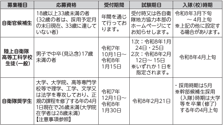 防衛省・自衛隊では、次のとおり自衛官等を募集しています。