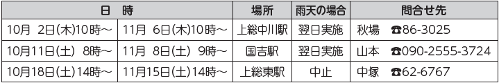 くらし いすみ鉄道草取りボランティア募集 54/68 前の記事 次の記事 発行日 : 2025年10月01日 自治体名 : 千葉県いすみ市 広報紙名 : 広報いすみ 令和7年10月号 いすみ鉄道駅構内などの草取りを行ってくれるボランティアを下記のとおり募集します。 ※作業内容などの詳細はお問い合わせください。(作業は約1時間) Tweet シェアする ふるさと納税返礼品募集中 太東埼燈台環境整備ボランティア募集