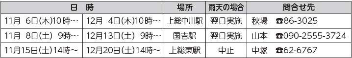 くらし いすみ鉄道草取りボランティア募集 45/65 前の記事 次の記事 発行日 : 2025年11月01日 自治体名 : 千葉県いすみ市 広報紙名 : 広報いすみ 令和7年11月号 いすみ鉄道駅構内などの草取りを行ってくれるボランティアを下記のとおり募集します。 ※作業内容などの詳細はお問い合わせください。(作業は約1時間) Tweet シェアする 全国豊かな海づくり千葉県大会におけるテーマ・デザインを募集します 太東埼燈台環境整備ボランティア募集