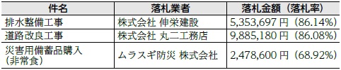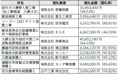 落札金額が建設工事500万円以上・業務委託300万円以上・物品購入など200万円以上のものを掲載します。なお、全入札結果は、入札情報サービス、市役所受付行政情報コーナー、財政課で公表しています。
