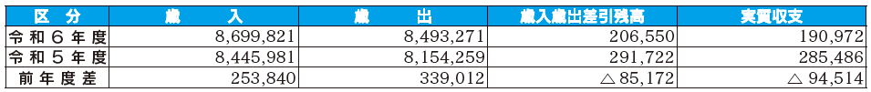 一般会計の歳入歳出決算は、歳入が86億9,982万1千円、歳出が84億9,327万1千円で、差し引きは2億655万円でした。この中には、翌年度へ繰り越すべき財源として1,557万8千円が含まれていますので、令和6年度の実質収支は、1億9,097万2千円の黒字となりました。