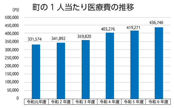 1人当たりの医療費は、令和元年度から令和6年度にかけて10万円以上増加しており、今後も増加する見込みです。