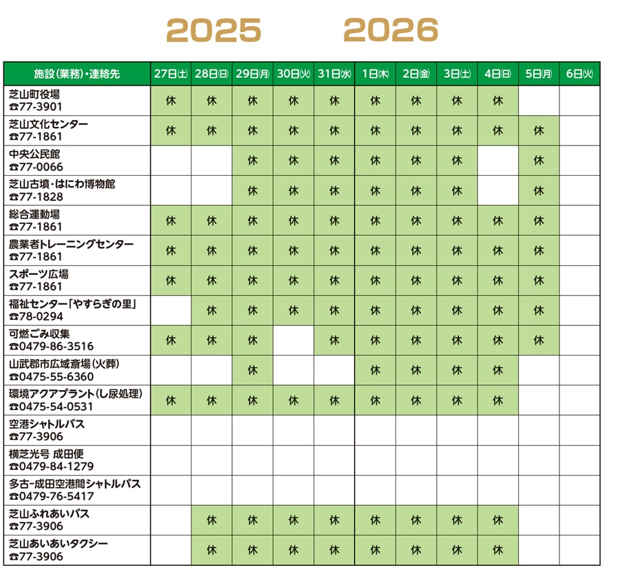 くらし 年末年始の業務日程 36/38 前の記事 次の記事 発行日 : 2025年12月01日 自治体名 : 千葉県芝山町 広報紙名 : 広報しばやま 令和7年12月号 ※年末は、し尿の収集が込みあうため年内に臨時の収集を希望する方は、12月12日(金)までの平日にご連絡ください。 ※可燃ごみ収集に時間を要する場合、翌日も収集を実施する場合があります。 Tweet シェアする まちのうごき あとがき