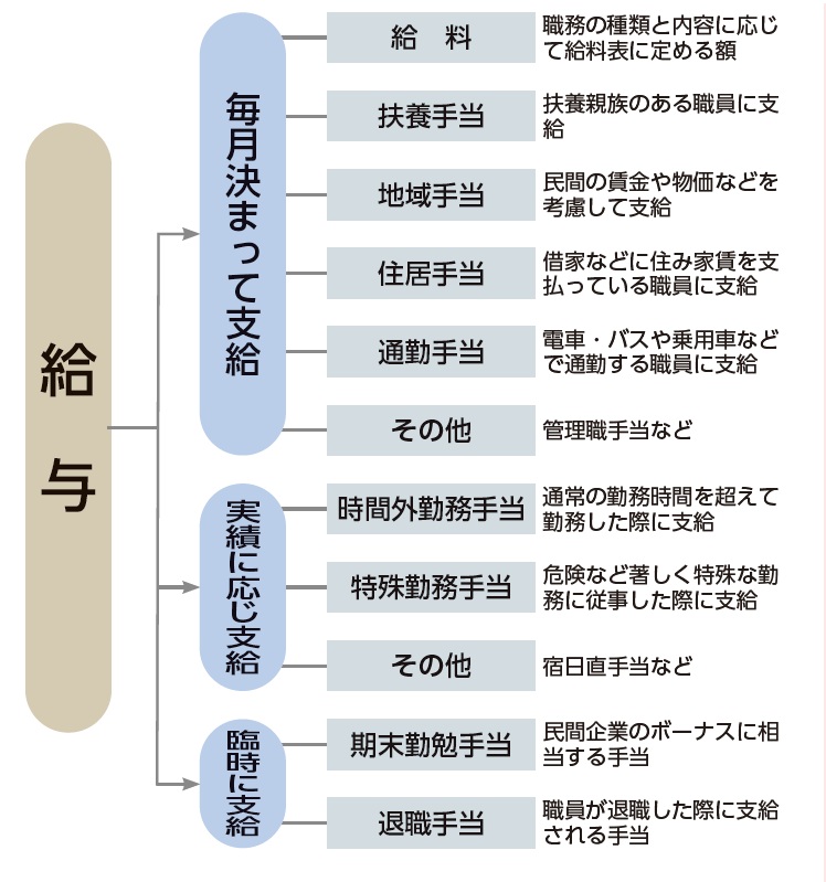 地方公務員の給与は、法律により一般家庭の生計費、民間企業の賃金などを考慮して決めることになっており、芝山町職員の給与は、独自の人事委員会を持っていないため国や県の勧告に基づき、町議会の審議を経て条例で定められています。