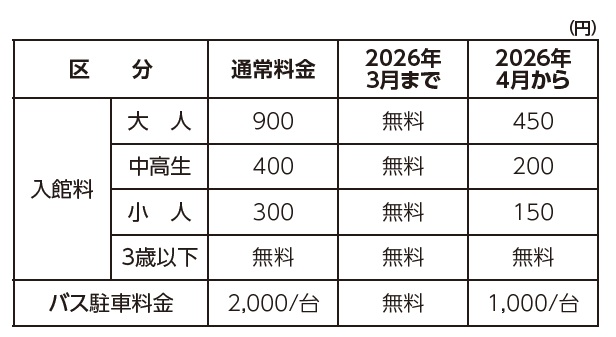 本年度は「町制施行70周年」という節目の年を記念し、芝山町在住の方につきましては、本年10月1日から2026年3月までの期間、入館料を無料とさせていただきます。また、2026年4月以降につきましては、より多くの町民の皆様にご利用いただきたいとの思いから、入館料を通常料金の半額とさせていただきます。