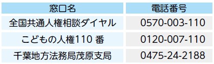 また、千葉地方法務局茂原支局と茂原人権擁護委員協議会では、人権週間にちなみ「特設人権相談所」を開設しています。いじめ、家庭問題(親子・夫婦・相続など)、借地・借家、差別、いやがらせなど、人権擁護委員が皆様のご相談に応じます。