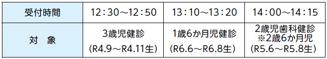 検診内容:身長・体重測定、内科診察(3歳児、1歳6か月児のみ)、尿検査・眼科屈折検査(3歳児のみ)、歯科診察、フッ化物塗布(希望者)、歯科指導、保健指導、栄養指導、育児相談