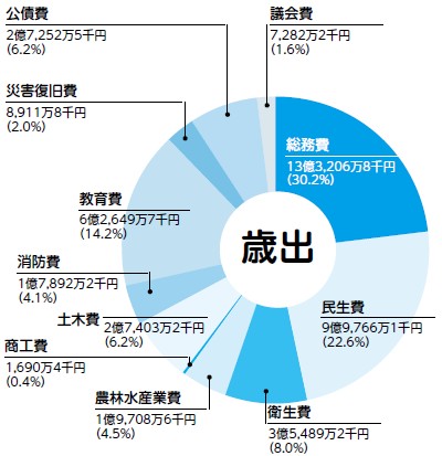 歳出総額は前年度比7.0%増の、44億1,252万7千円となりました。総務費は、システム標準化移行にかかる経費の増加や中学校校舎改築のための基金積立てなどにより、前年度比38.3%増となりました。