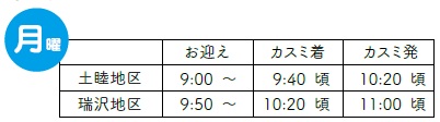 行ける場所:カスミ、道の駅、町役場、診療所、公民館、郵便局(上市場、睦沢)