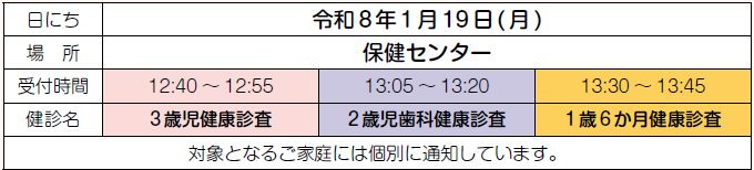 身長、体重、頭囲の測定、内科診察、歯科診察、フッ素塗布、栄養・子育て相談などを行います。