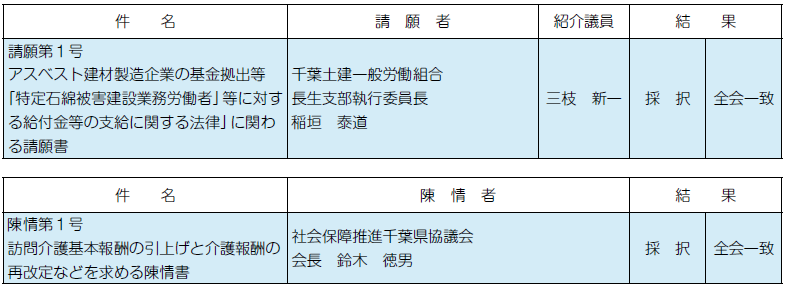 本会議での審議の結果、下記のとおり採択となりました。また、採択された請願、陳情に係る意見書の提出については、議員発議の発議案として可決され、関係行政庁へ意見書を提出しました。