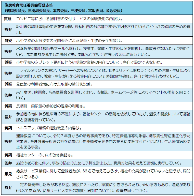 3月11日、12日に開催された予算常任委員会で第1回定例会により付託された「令和7年度予算審査」を行い、21日の本会議にて総務事務並びに住民教育所管の予算を可決しました。また、各常任委員会での主な質疑応答は以下のとおりです。