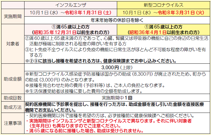 インフルエンザ・新型コロナウイルスの発症や重症化を防ぐことを目的として、予防接種費用の一部を助成します。満65歳以上の方には9月末に予診票を個別通知しますので内容をよくご確認いただき、接種を受けるまで大切に保管してください。
