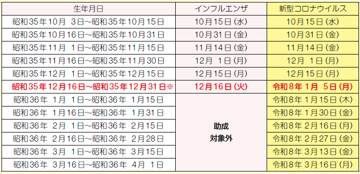 ※昭和35年12月16日~昭和35年12月31日生まれの方は、インフルエンザと新型コロナウイルスの予診票が別々に送付されます。インフルエンザは例年12~3月に流行が見られるため、流行期前に65歳を迎えたらすぐに接種が完了できるよう早めに予診票を送付します。