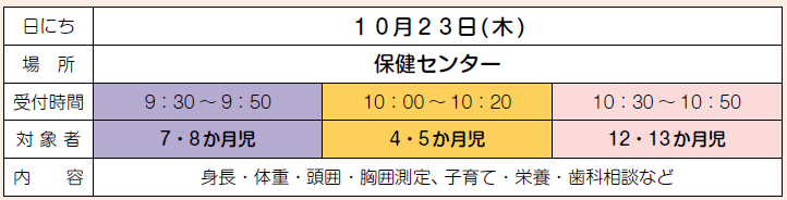 内容:身長、体重測定、内科診察、栄養・子育て・就学相談など