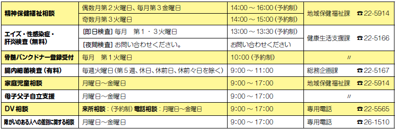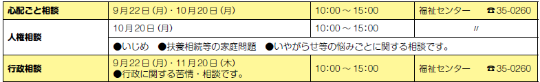※心配ごと相談・人権相談・行政相談については、相談日に限り電話でのご相談も受け付けています。