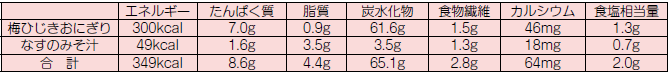 「おにぎりとみそ汁」は朝食でも手軽に栄養がとれるメニューです。暑い時期に食べやすい梅干しと、鉄分補給になるひじき、カルシウムなどが豊富なしらす干しで、朝から栄養をとりましょう。旬のなすをごま油で炒めることで風味とコクが加わり、そのまま煮る場合とは違った美味しさが味わえます。