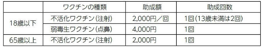 ※接種費用のうち、上記の助成額を町が負担します。窓口では助成額を除いた額をお支払いください。生活保護受給者は、健康福祉課の窓口で接種費用免除申請の手続きを行うことで接種費用が無料となります。