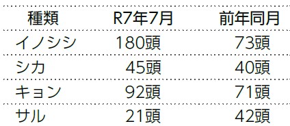今夏はイノシシやシカなど大型動物の出没・稲の食害も多かったようです。さらなる摩擦を防ぐためにも、捕獲による調整は必要です。