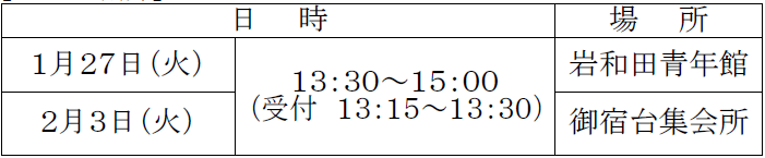 持ち物:タオル・飲料水(水分補給)・上靴(御宿台集会所のみ)