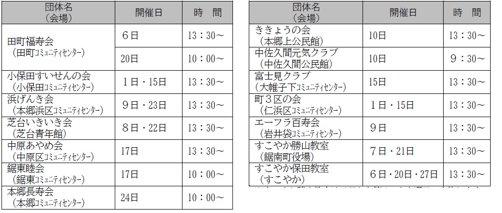 掲載のない教室の実施予定は、各教室のリーダーにお問い合わせください。
