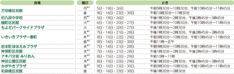 健康 1月のシルバートレーニングスタジオ 15/37 前の記事 次の記事 発行日 : 2025年12月20日 自治体名 : 東京都千代田区 広報紙名 : 広報千代田 令和7年(2025年)12月20日号No.1654 定員に達している会場もあります。新規登録希望者は必ずお問い合わせください。 対象:65歳以上の区内在住者 ※登録者は登録会場で毎週1回の参加可 (※1)2部制。どちらも同じ内容 (※2)指導員は不在。指導員の指導映像を投影して行う 問合せ:社会福祉協議会高齢者活動センター 【電話】03-3265-1161 Tweet シェアする 1月のはあとカフェ のびのび子育て