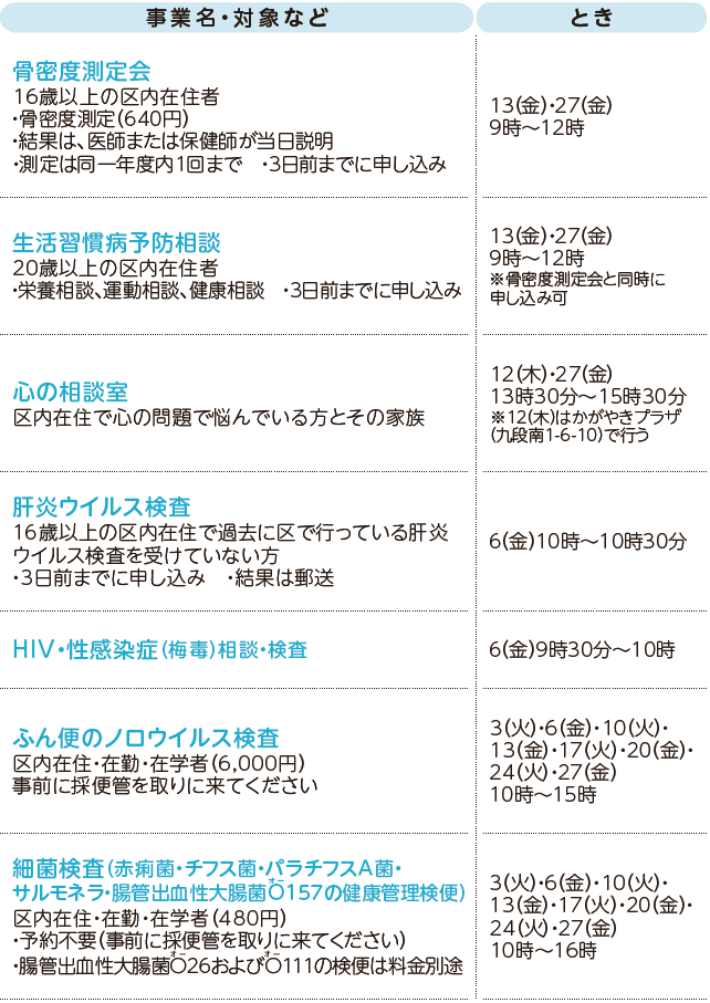 健康 2月の健康チェック(予約制) 30/37 前の記事 次の記事 発行日 : 2026年01月20日 自治体名 : 東京都千代田区 広報紙名 : 広報千代田 令和8年(2026年)1月20日号No.1656 会場:千代田保健所(九段北1-2-14) 問合せ:【電話】03-5211-8161【FAX】03-5211-8192 Tweet シェアする 2月の保健ガイド(予約制) 2月の各種相談(無料/受付時間は終了の30分~1時間前)