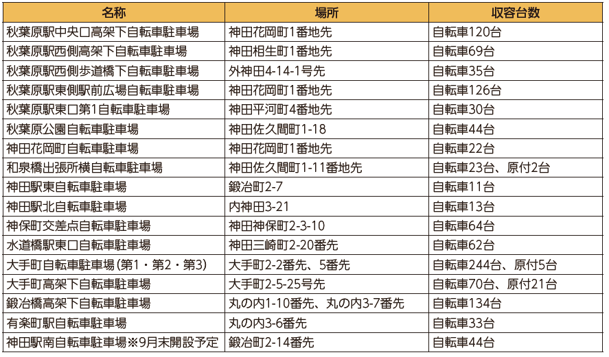 キャンペーン期間中、駅周辺を中心に放置自転車の撤去と、自転車利用者へのルール周知・マナー向上の取り組みを強化します。区内の駐輪場(一時利用)は下表をご覧ください。
