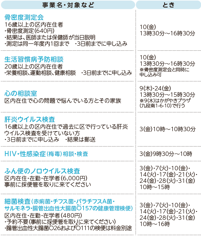 健康 10月の健康チェック(予約制) 36/42 前の記事 次の記事 発行日 : 2025年09月20日 自治体名 : 東京都千代田区 広報紙名 : 広報千代田 令和7年(2025年)9月20日号No.1648 会場:千代田保健所(九段北1-2-14) 問合せ:【電話】03-5211-8161【FAX】03-5211-8192 Tweet シェアする 10月の休日応急診療 10月の保健ガイド(予約制)