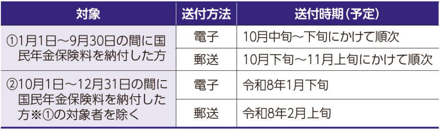 日本年金機構から「社会保険料(国民年金保険料)控除証明書」が対象者に送付されますので、大事に保管し、年末調整や確定申告に使用してください。