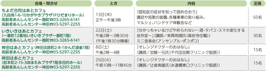 くらし 11月のはあとカフェ 17/35 前の記事 次の記事 発行日 : 2025年10月20日 自治体名 : 東京都千代田区 広報紙名 : 広報千代田 令和7年(2025年)10月20日号No.1650 認知症の情報共有や交流ができるカフェ。専門スタッフとの個別相談もあり 対象:認知症に関心がある方 申込方法:電話で ※日時と内容は変更になる場合あり Tweet シェアする 11月のはあとサロン 11月のシルバートレーニングスタジオ