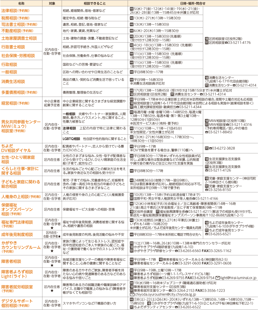 くらし 11月の各種相談(無料/受付時間は終了の30分~1時間前) 27/35 前の記事 次の記事 発行日 : 2025年10月20日 自治体名 : 東京都千代田区 広報紙名 : 広報千代田 令和7年(2025年)10月20日号No.1650 ★家族、介護などの事業者も相談可 日程が変更になる場合があります。事前にお問い合わせください。 Tweet シェアする 11月の保健ガイド(予約制) 令和8年1月のスポーツ施設の利用申し込み(スポーツセンターのみ令和8年2月分)