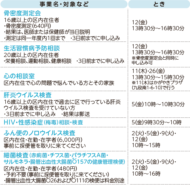 健康 12月の健康チェック(予約制) 33/39 前の記事 次の記事 発行日 : 2025年11月20日 自治体名 : 東京都千代田区 広報紙名 : 広報千代田 令和7年(2025年)11月20日号No.1652 会場:千代田保健所(九段北1-2-14) 問合せ:【電話】03-5211-8161【FAX】03-5211-8192 Tweet シェアする 12月の休日応急診療 12月の保健ガイド(予約制)