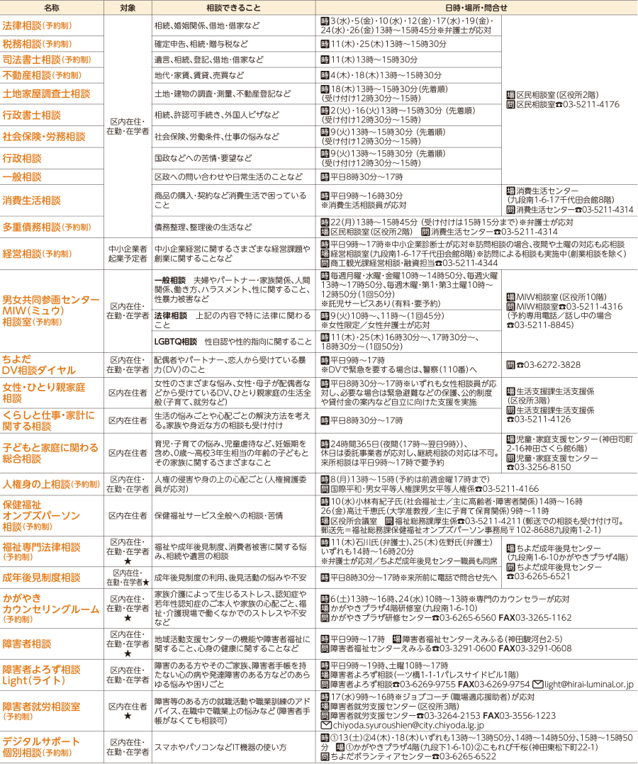 くらし 12月の各種相談(無料/受付時間は終了の30分~1時間前) 35/39 前の記事 次の記事 発行日 : 2025年11月20日 自治体名 : 東京都千代田区 広報紙名 : 広報千代田 令和7年(2025年)11月20日号No.1652 ★家族、介護などの事業者も相談可 日程が変更になる場合があります。事前にお問い合わせください。 Tweet シェアする 12月の保健ガイド(予約制) 令和8年2月のスポーツ施設の利用申し込み(スポーツセンターのみ令和8年3月分)