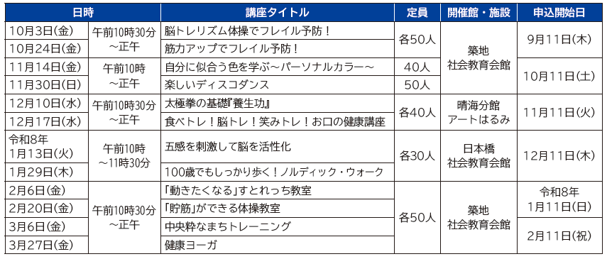 運動機能や栄養状態の改善、認知機能の向上などに役立つ1回完結型の講座です。区内のサークルや講座・イベントの紹介も行います。
